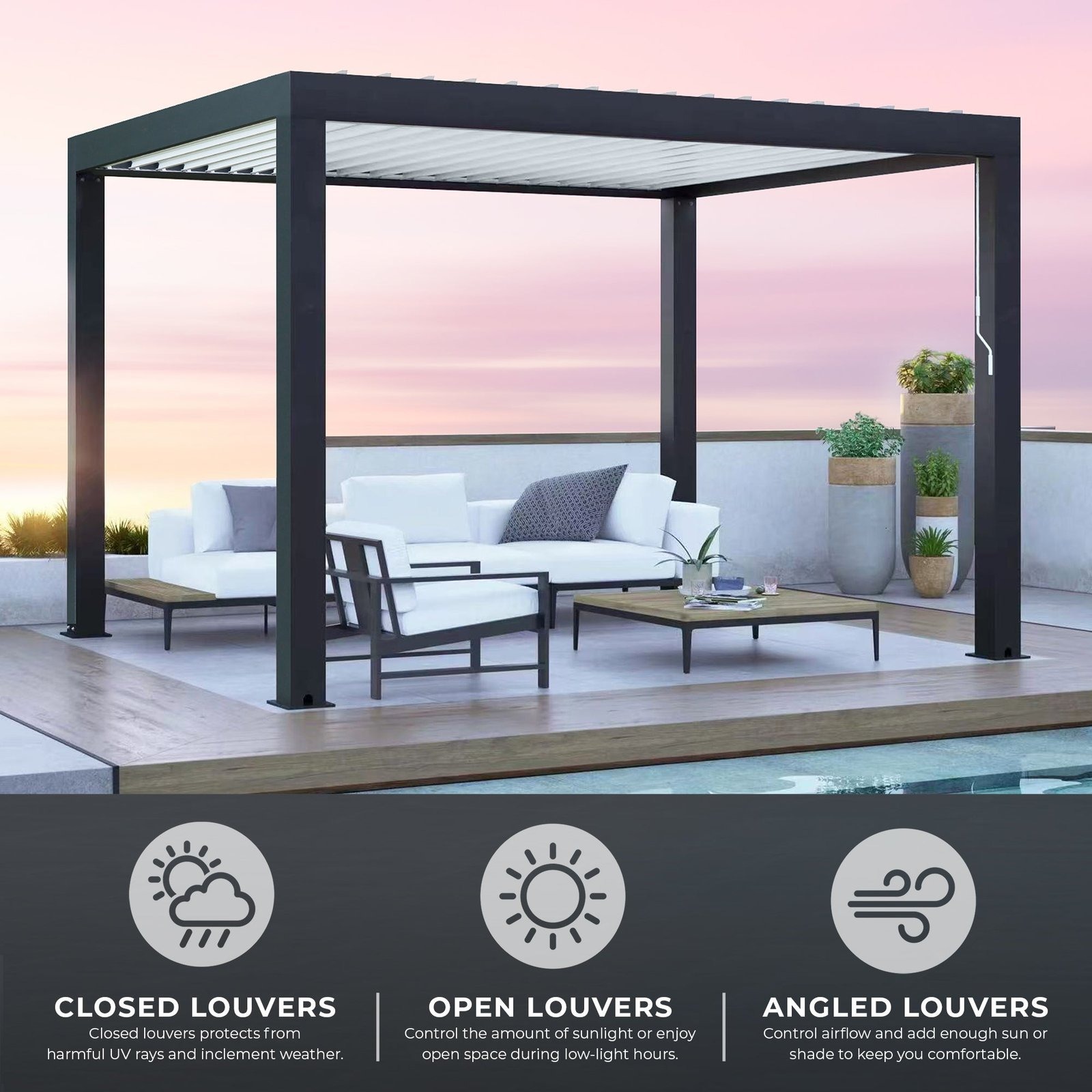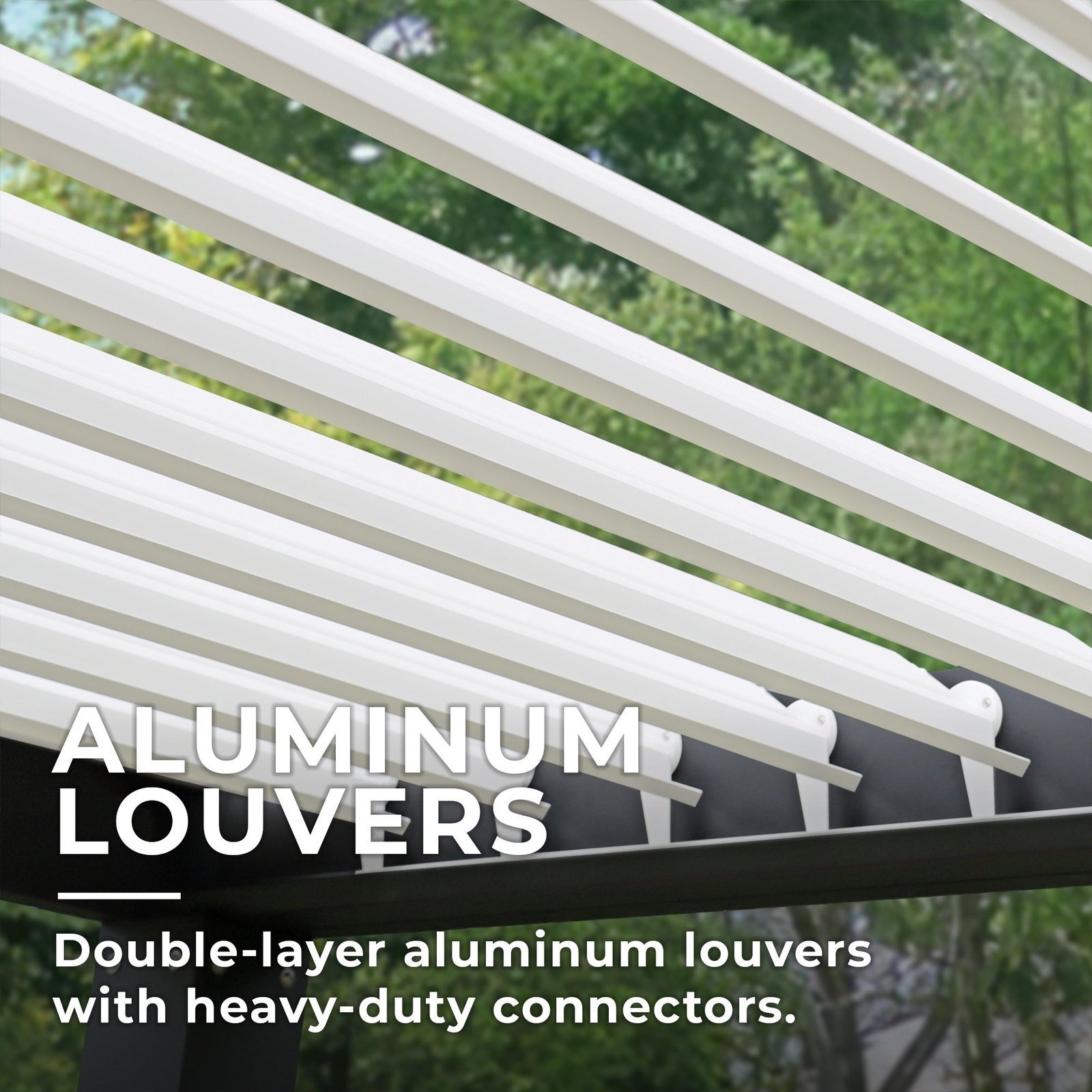 The double-layer aluminum louvered roof with heavy-duty connectors is operated by a smooth hand crank, letting you transition from full sun to complete shade in seconds — or angle the louvers anywhere in between for the perfect airflow and light balance. A double beam roof support system with corner connectors and triangle gussets at each post top ensures exceptional structural integrity. An integrated gutter system with downspouts hidden neatly inside each post channels rainwater away invisibly, keeping the look clean and your space dry. Large post bases with heavy-duty fasteners lock the structure firmly in place for long-lasting stability season after season.